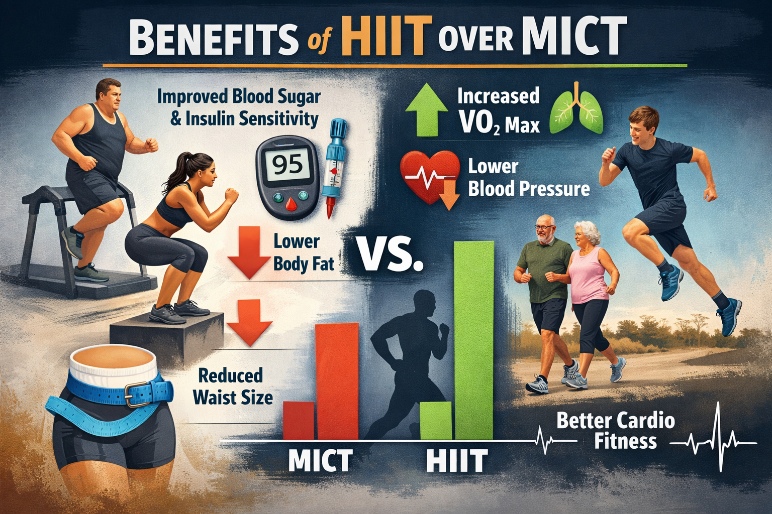 A 2022 systematic review found that HIIT significantly enhanced glycemic control and insulin sensitivity compared with no training, and produced similar or better VO₂max gains compared with MICT. In overweight and obese populations, HIIT was shown to outperform MICT on improving cardiorespiratory fitness and reducing markers of cardiometabolic risk over time.