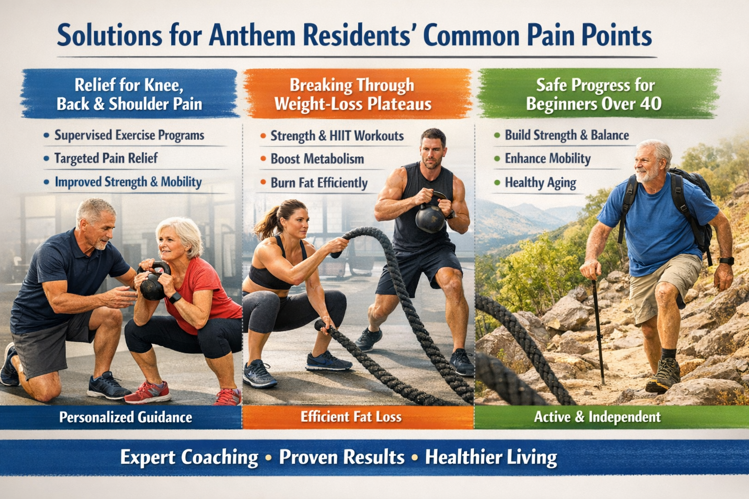 For Anthem residents over 40, stronger legs and better balance make daily activities—like walking trails, climbing stairs, and getting in and out of cars—easier. This reduces injury risk and reliance on others, supporting independence and quality of life. Combining strength, balance, and mobility offers a complete approach to healthy aging that keeps you active for years.